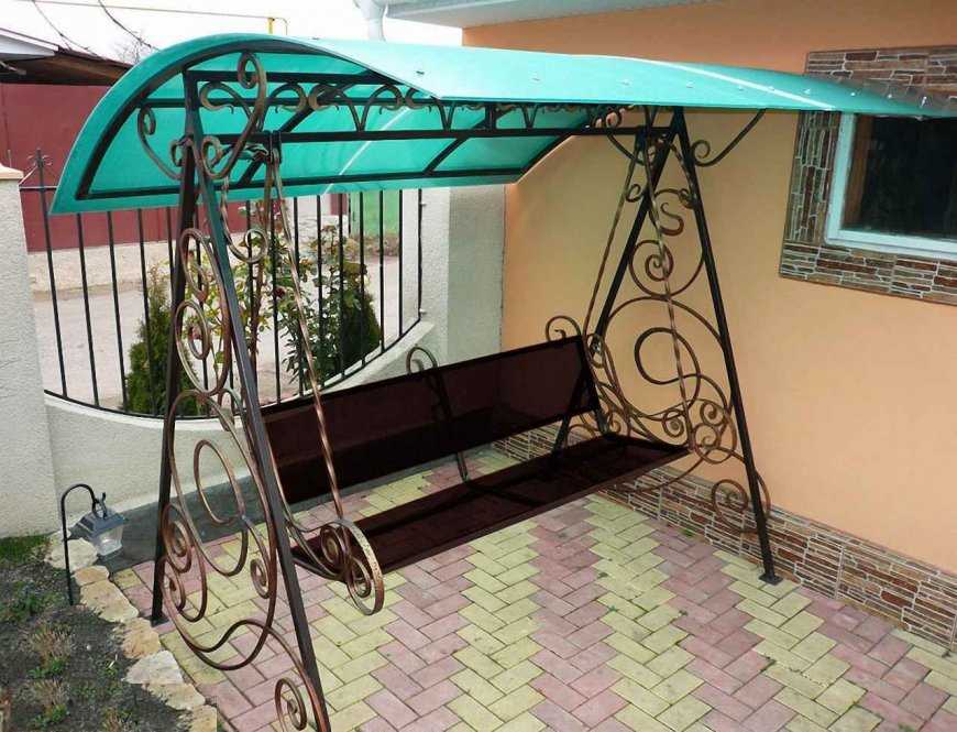 - часто конструкция прикрывается поликарбонатным козырьком либо натянутым тентом – для укрытия от лучей солнца, мелкого дождя.