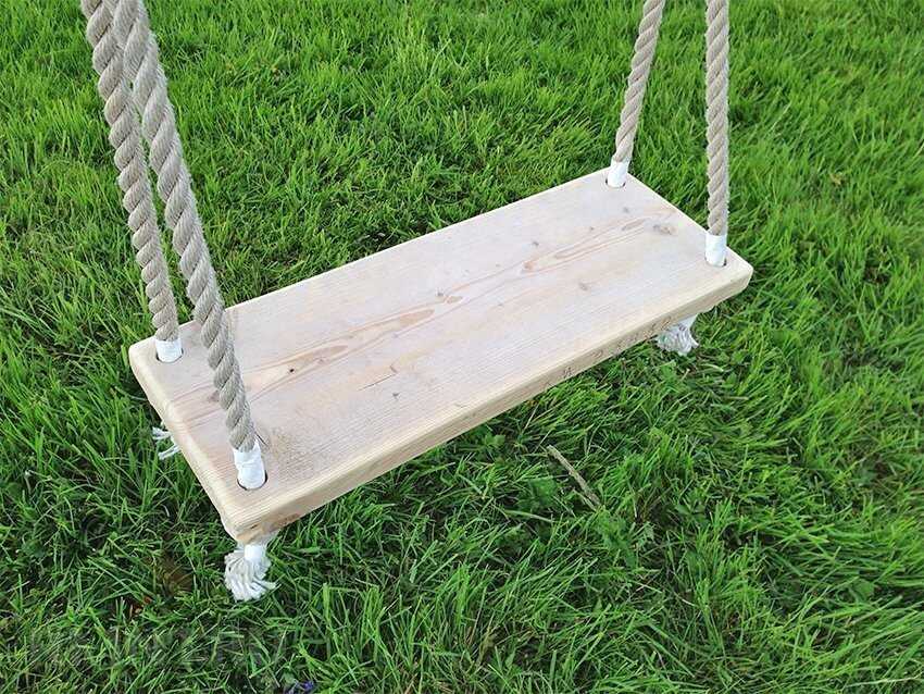 Самый простой вариант – взять отрезок прочной доски прямоугольной формы, сделать по краям отверстия и вставить в них веревку. Умельцы могут на этом не останавливаться: деревянное сиденье можно снабдить спинкой и подлокотниками.