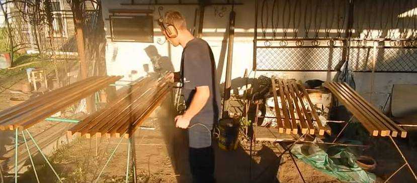 Для скамьи используются стандартные бруски. Например, 30х30х6000 мм, укороченные до 1500 мм, понадобится 24 шт. Бруски зачищаются на станке либо наждачкой вручную.