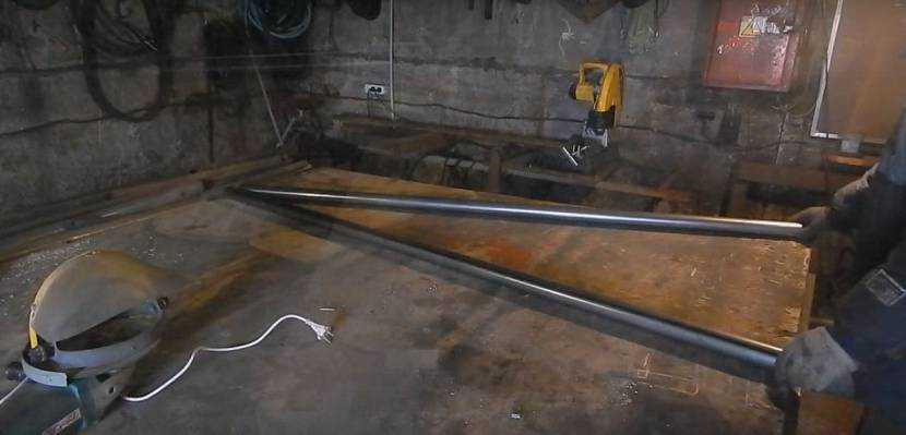 Сначала нарезаются требуемые элементы. Для торцевых опор нужны 4 отреза по 2,5 м, для поперечины – отрез 2,1 м.