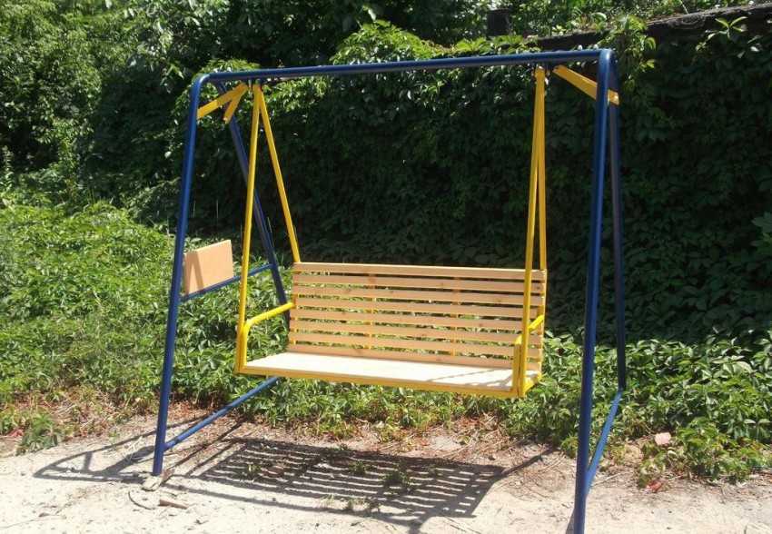 Безопасные качели на даче должны иметь широкое, лучше монолитное, основание. Если планируется использование стандартных прямых ножек, которые не предусматривают дополнительного упора, потребуется предварительная подготовка места монтажа. Это необходимо для предотвращения погружения опор в почву. Крепление к земле выполняется при помощи шпилек или скоб. Несущая рама производится из металла, профильных труб с диаметром 7 см или бруса. Различаются следующие разновидности конструкций:
