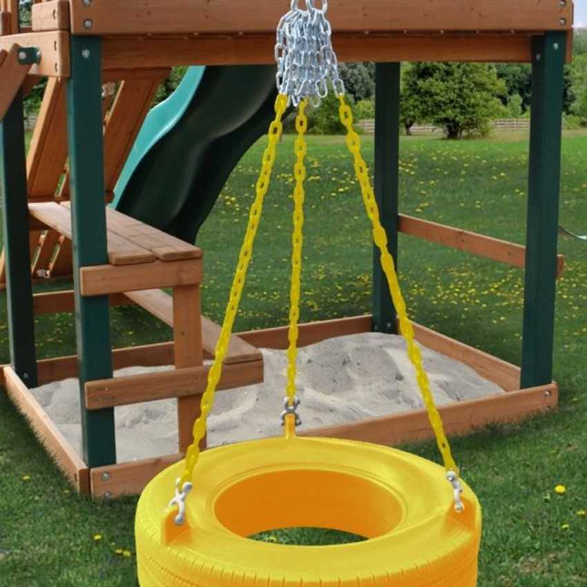 - Цепи. Позволяют менять высоту расположения качелей. Плюсы: долговечность, прочность, защита от влаги и огня, устойчивость к высоким нагрузкам. Минусы: поперечные колебания при раскачивании, поверхность холодная на ощупь.