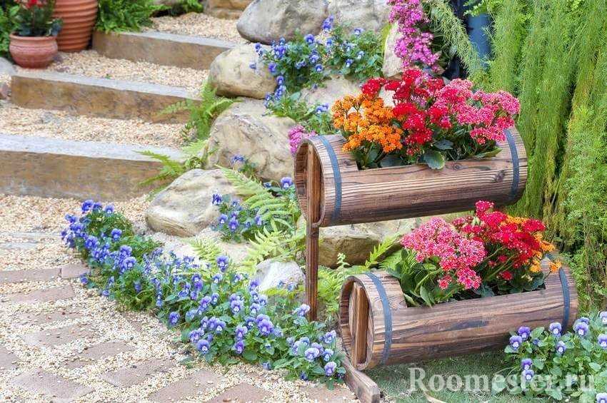 Вы можете использовать старую деревянную бочку как стенд, наполненный прекрасными растениями и яркими цветами.