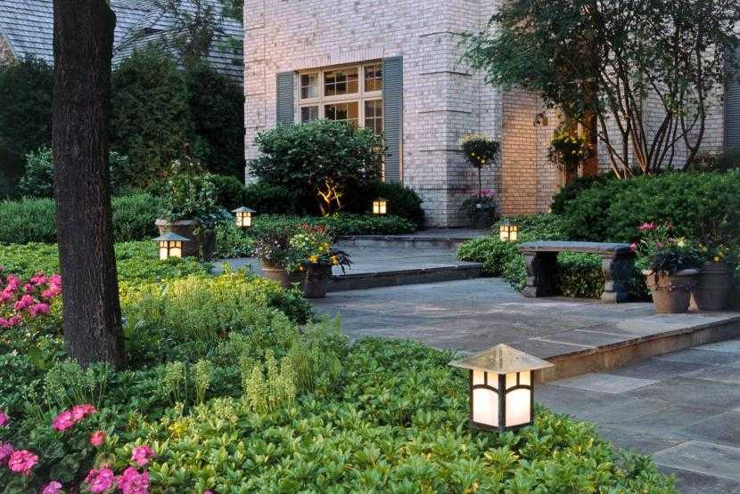 - Если вы не хотите наполнять сад декоративными элементами, акцент можно сделать другим способом, например, оформить садовую дорожку светильниками.