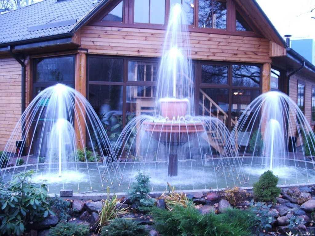 Можно ли сделать фонтан без насоса? Можно, но открытого типа. Например, вывести в пруд трубу водопровода — центрального или подающего воду из колодца или скважины. Выходящая под давлением вода будет давать какой-то высоты струю. Установив на трубу наконечник, сможем изменить ее форму. Но при таком построении необходимо придумать, куда отводить воду. Можно — обратно в колодец или в речку, на участок для полива и т.п. Хотя при такой организации насос присутствует, но он качает воду в дом, а фонтан — только одна из точек расхода.