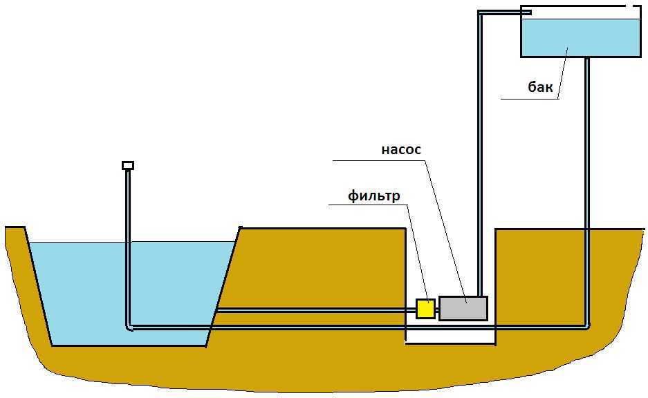 Насос закачивает воду в бак, после чего она стекает по трубе вниз