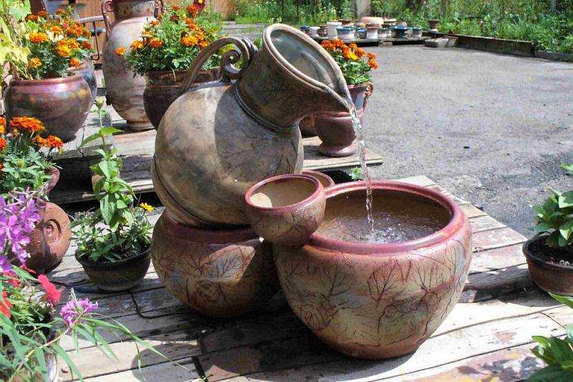 Подобным образом можно организовать фонтан для дачи, если есть какой-то источник, из которого основная емкость будет постоянно пополняться.