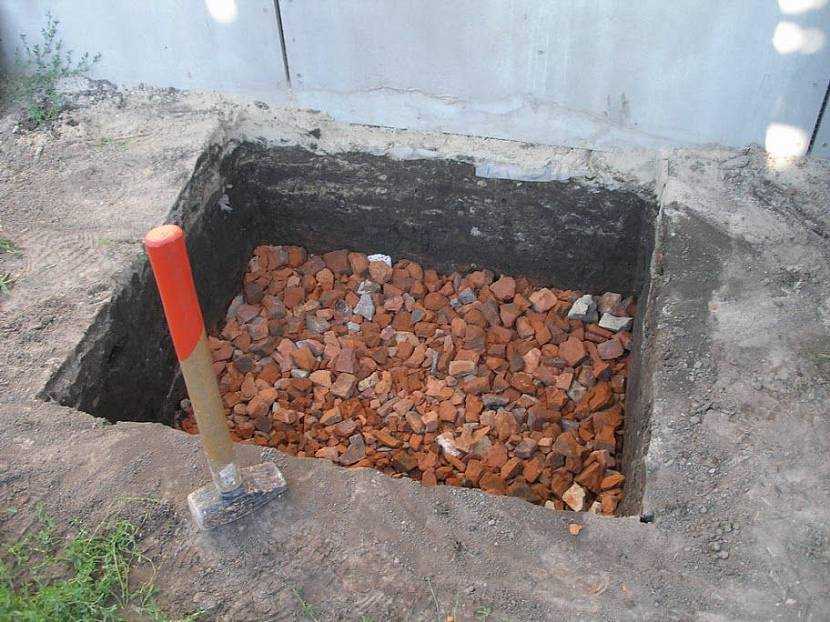 - На дно засыпают щебень, который тщательно утрамбовывают. Размер этого слоя в утрамбованном виде должен быть не менее 30 см.