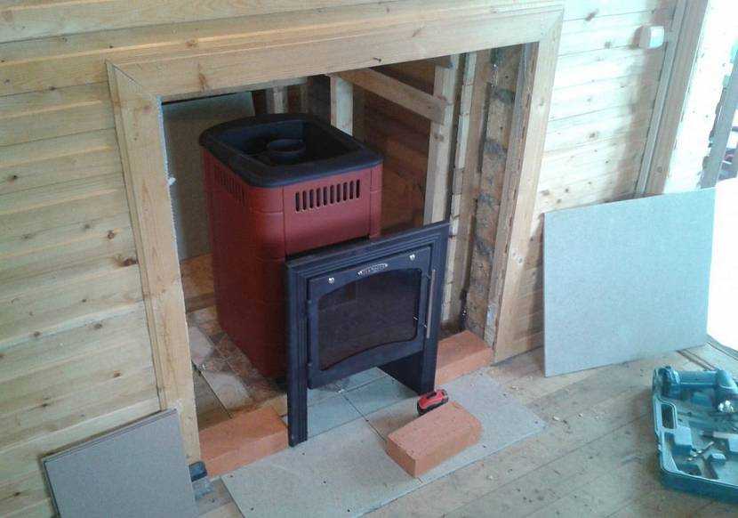 Если стоит задача, как установить печь в бане с топкой из предбанника своими руками, то при наличии перегородки между ним и парным отделением часть её придётся вырезать. Если перегородки нет, лучше сразу возвести её из негорючего материала, например, из красного кирпича. Или выложить кладку до нужной высоты, а продолжить брусом.