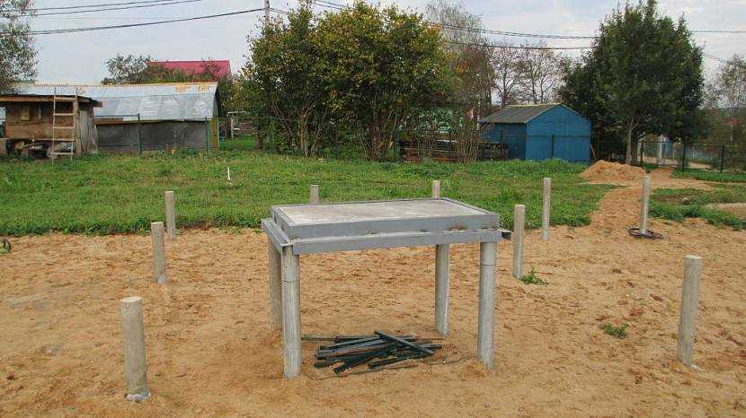 Монтировать свайную плиту нужно на предварительно залитые столбики или сваи. Сваи используют если глубина промерзания почвы менее 1,5 м, в остальных случаях подходят столбики. Для их монтажа роют несколько небольших ям и засыпается песчаная подушка 15–20 см, проливается и трамбуется. Затем засыпается гравий и делается опалубка. Вставляется армированная основа и заливается бетоном из влагостойкого цемента. После застывания демонтируется опалубка и вокруг столбики засыпается крупным песком. Сверху вырезается под размер рубероид и расстилают в 2-а слоя. Потом выкладываются столбики из красного кирпича в 2-а ряда. Высота зависимости от основного фундамента бани. Сверху на столбики укладывается железобетонная плита. Фундамент готов.