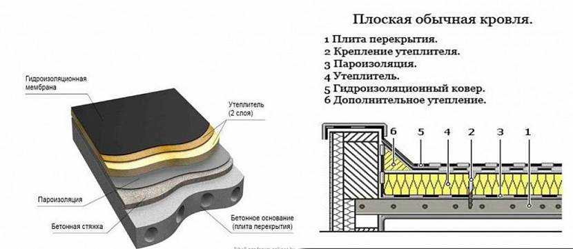 Порядок расположения слоев гидроизоляции на плоской кровлеИсточник potolko.ru