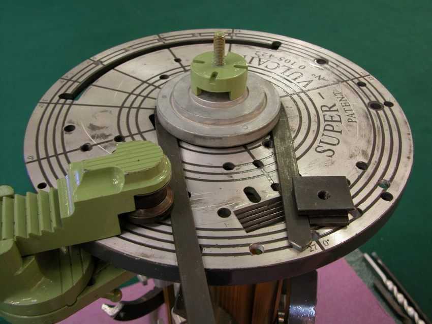 В усовершенствованном варианте приспособления улитка, в основание вместо шаблона вкручиваются упоры. Конец детали зажимается в центре. Второй упирается в плоскость. Деформация производится вращением стола.
