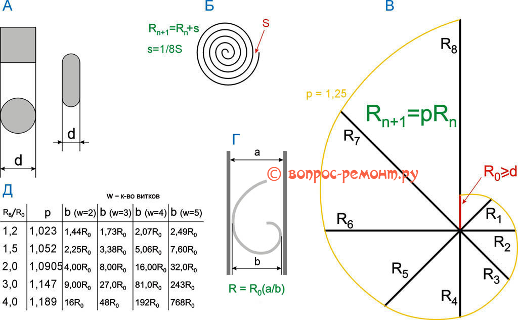 В случае, когда требуется более плотная арифметическая спираль, при повороте образующего ее радиуса на те же 45 градусов к предыдущему радиусу прибавляется 1/8 шага спирали S, поз. Б. В том и другом случае R0 берут равным или большим поперечника d заготовки равномерного сечения, поз А. Если начальный конец заготовки заострен, R0 может быть и меньше d, вплоть до предела пластичности металла.