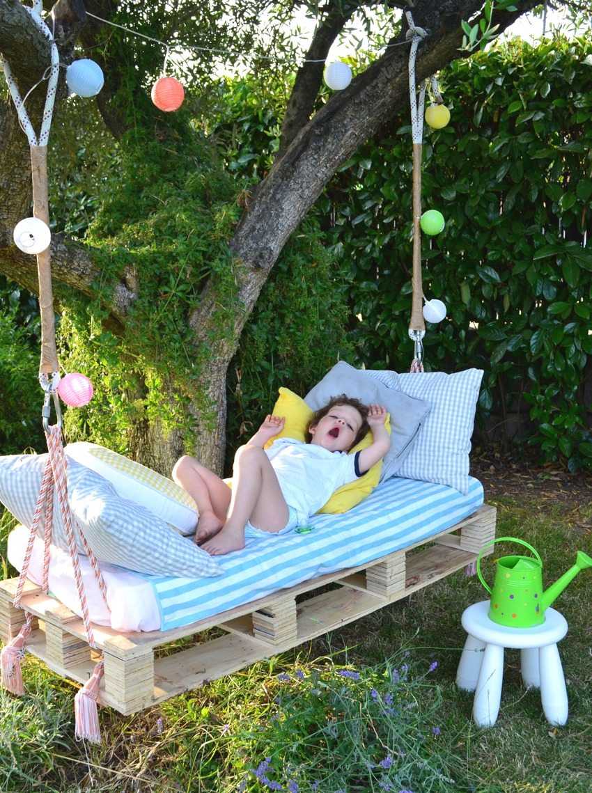Уютные детские качели из паллет с мягким матрасом и подушками