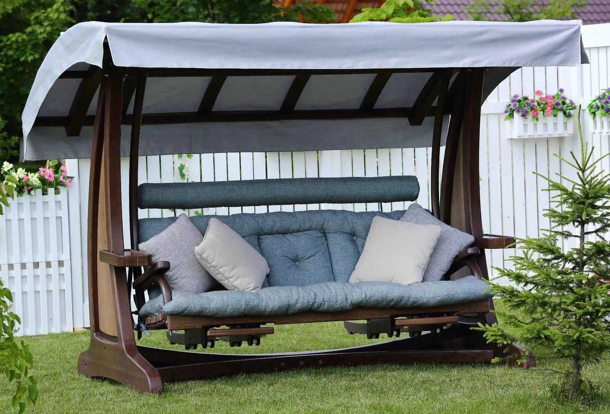Полог или навес защитит от солнца, дождя. Самый простой вариант – натянуть на конструкцию тканый материал в виде маркизы. Такие применяют, устанавливая диван качели для дачи. Рейки держат плотную ткань, не давая ей сместиться.