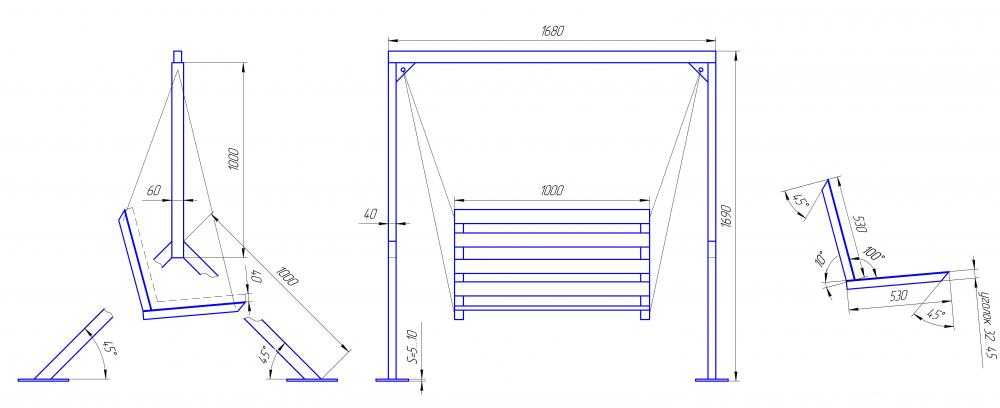 Точно такие же габариты стараются придать задним сиденьям автомобилей, так как они позволяют свободно рассаживаться всем без намека на стеснение. Если планируется пользоваться качелями в одиночку, хватит и сиденья шириной 1 м. Делать конструкцию крупнее — значит, уже тратить зря строительные материалы. В чертежах требуется отразить толщину круглых труб для изготовления стоек и иных деталей. Их диаметр может варьироваться от 3,8 до 6 см.