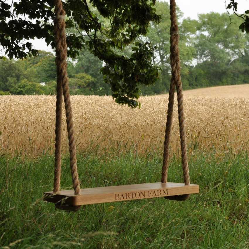 Простые детские качели для дачи, подвешенные на веревках к ветке дерева