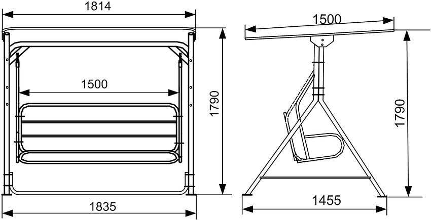 Составляя чертежи садовых качелей, надо показывать их габариты в трех плоскостях. Начинают с суммарной ширины (которая определяется по фасадной части конструкции). Вторая цифра показывает, какова глубина каркаса. Третье число означает высоту. Нежелательно использовать большие качели в уличных навесах или беседках.