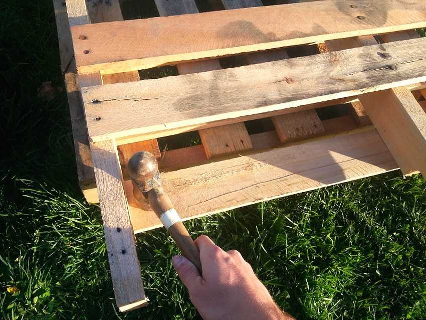 Для создания своими руками детской качели с полноценной спинкой потребуется два поддона. Как и в случае с деревянными конструкциями из досок и бруса, здесь также следует обработать поверхность шкуркой, чтобы избавиться от заусенцев. Изделие нужно хорошо очистить и окрасить с помощью красителя, предназначенного для древесины и уличных условий эксплуатации. Достаточно воспользоваться и влагостойким лаком, который не испортит красоту дерева.