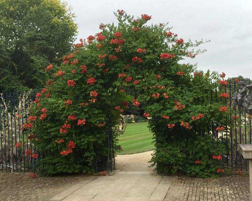 Кампсис. Еще один популярный многолетник, который отличается устойчивостью к морозам и хорошими показателями роста. Если температура воздуха опускается до экстремально низких значений, растение может замерзнуть. Но позже его можно успешно отрастить из корня. Воздушные корни позволяют лиане использовать практически все виды опор для своего распространения. Крупные блестящие листья зеленого цвета красиво сочетаются с большими трубчатыми цветками, напоминающими мельницы благодаря особой форме соцветий. Период цветения приходится на июль и август, затем начинают созревать плоды в виде длинных зеленых стручков. Через некоторое время их расцветка становится коричневой.