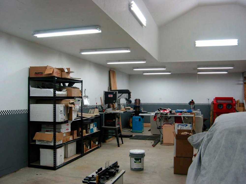 В качестве осветительных приборов подойдут лампы любого типа. Они могут быть энергосберегающими, люминесцентными, галогеновыми, простыми с нитью накаливания. В большом гараже лучше организовать зонирование, размещая приборы по модульному принципу. Для столов, рабочих поверхностей подойдет простая настольная лампа.