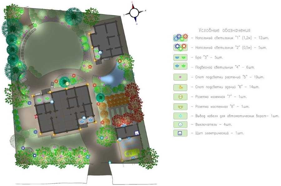 При составлении проекта освещения участка учитывают приемы подсветки и типы осветительных приборов