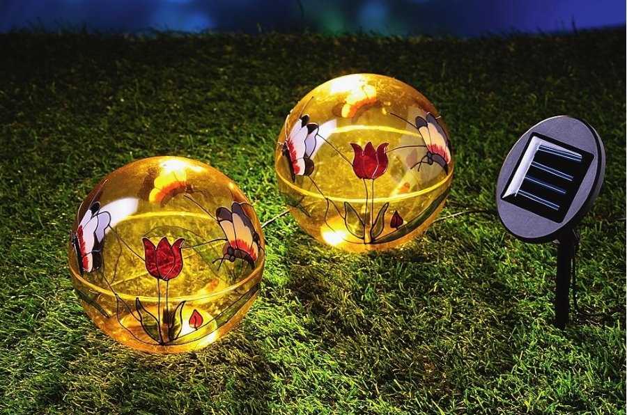 Светильники в виде шаров с изящной росписью станут изюминкой декоративного оформления газона