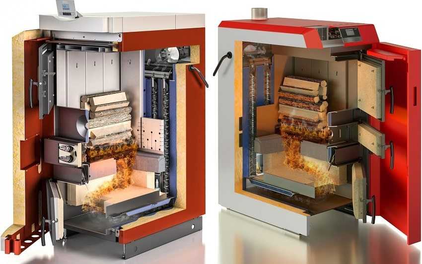 - Пиролизные котлы. Такие агрегаты в основном работают на дровах. В отличие от обычных печей, они имеют две камеры сгорания. В первой камере дрова подвергаются действиям высокой температуры без доступа воздуха, где они разлагаются, выделяя газ. Этот газ собирается и направляется во вторую топку, где он горит. Таким образом, достигается горение топлива без остатков. Главным минусом является высокая цена.