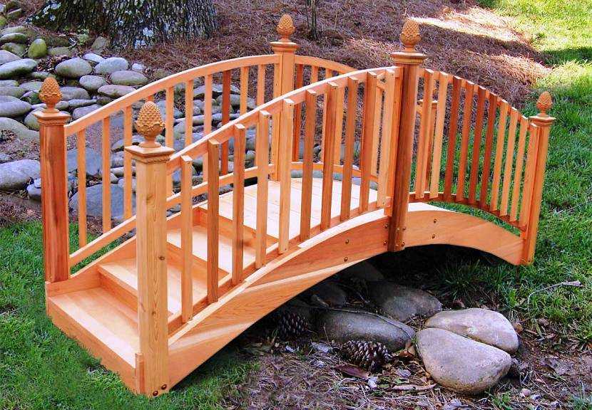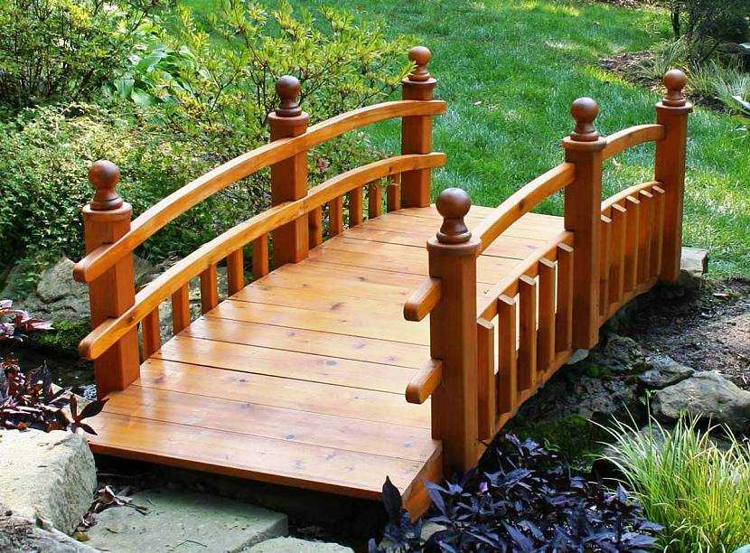 Самая распространенная древесина для таких мостиков – сосна. Варианты дороже изготавливают из дуба, ясеня и кедра. Деревянный мостик можно окрасить в любой цвет. Его форму можно сделать более покатой или плоской. А ремонт такого моста обойдется недорого.
