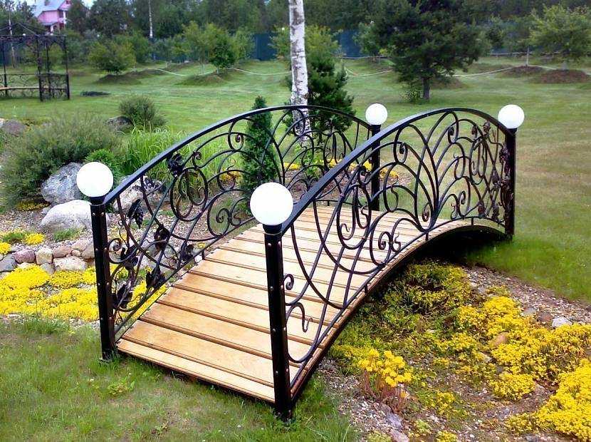 Такие мостики могут быть целиком из металла либо с каркасом из него и деревянным либо каменным настилом и/или перилами. Металл представляет наибольший простор в творчестве — ведь реально создать конструкцию любой формы, с любыми необычными и интересными узорами и элементами.