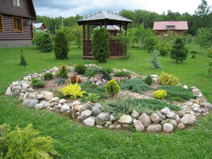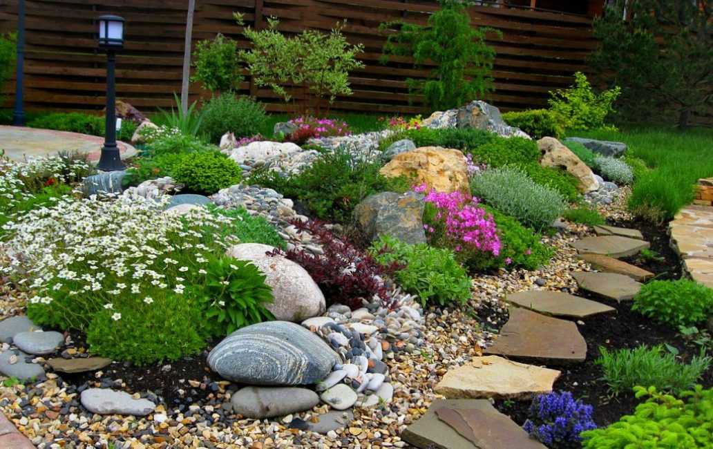 Дизайн рокария сопоставляется со стилем участка и вписывается в рельеф местности