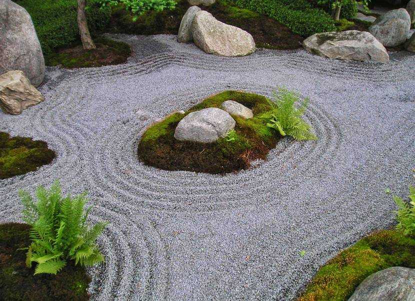 Для создания японского стиля следует выбирать крупные булыжники неправильной формы. Между основными элементами засыпается галька. Цветущие растения неприемлемы для такого оформления. Здесь возможно использование только зелёных низкорослых растений, которые оживляют каменистый сад. Каждая деталь ландшафтного дизайна имеет своё место. Кустарники обязательно подстрижены. Здесь нет места хаотичному разрастанию.