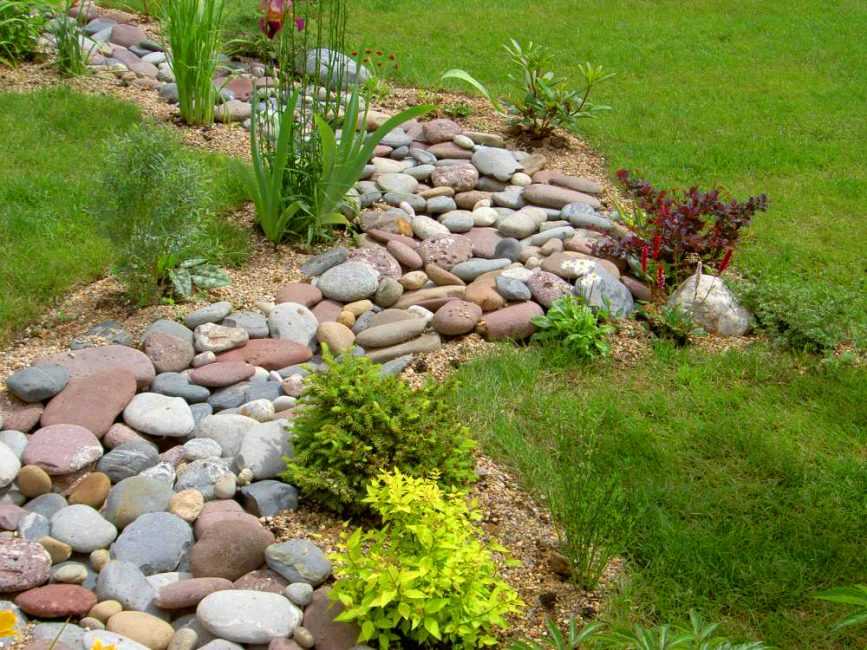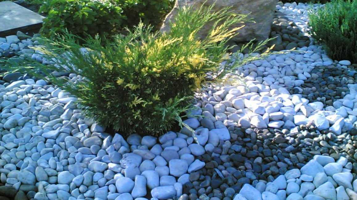 Использование гальки, гравия, дробленого сланца позволяет заполнить пустые пространства и оформить границы рокария