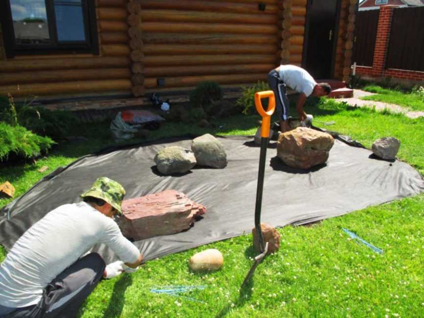 Следующий этап — установка камней. Начинают с крупных валунов, стараясь избегать симметрии, четких форм и фигур.