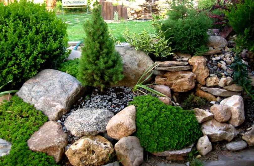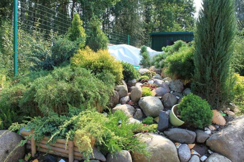 Скала. Этот вариант замечательно смотрится на естественных крутых склонах. Снизу расположены крупные валуны, они окружаются средними. Ближе к вершине альпинария находятся камни помельче. В антураже этой мини-скалы отлично смотрятся можжевельники, хвойники, карликовые сорта папоротников.