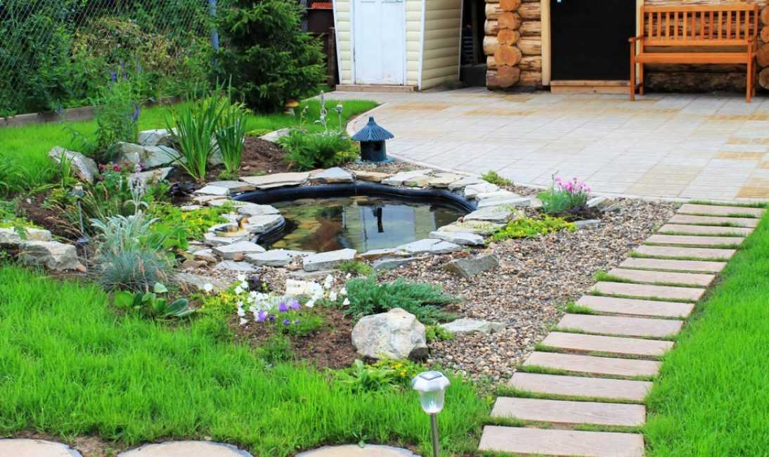 - Мини-альпинарий, сочетающийся с водоемом. Изумительный эффект достигается благодаря наличию даже небольшой чаши в основании камней, которая будет имитировать водоем. Такой элемент композиции сделает ее еще более очаровательной и привлекательной. Дополнение в виде мини-водопада или фонтанчика сделает это место самым притягательным на всей дачной территории.