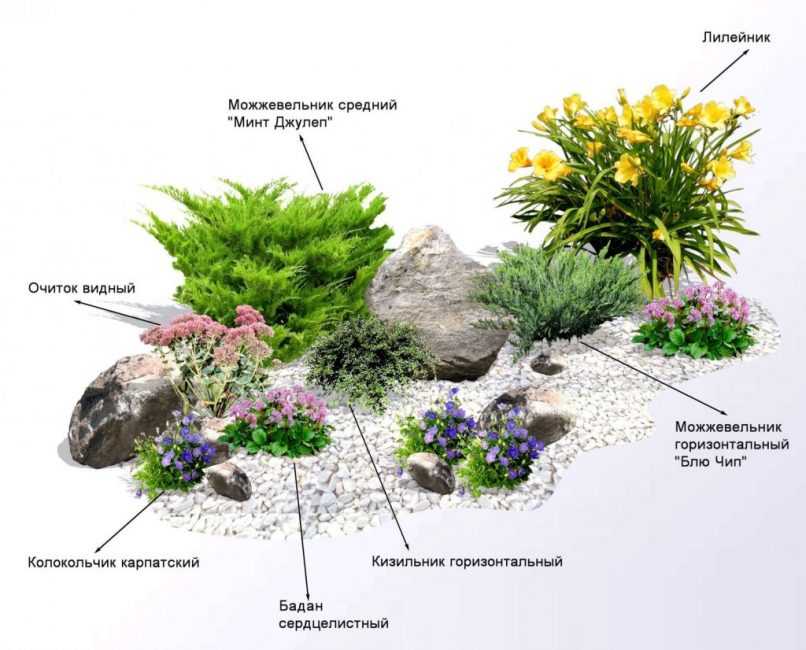 Совет. Нужно помнить, что россыпь гальки по всей площадке между растительностью и валунами является непременным условием грамотно устроенного рокария. Главное правило — чем меньше растение, тем мельче вокруг него должны быть камни.