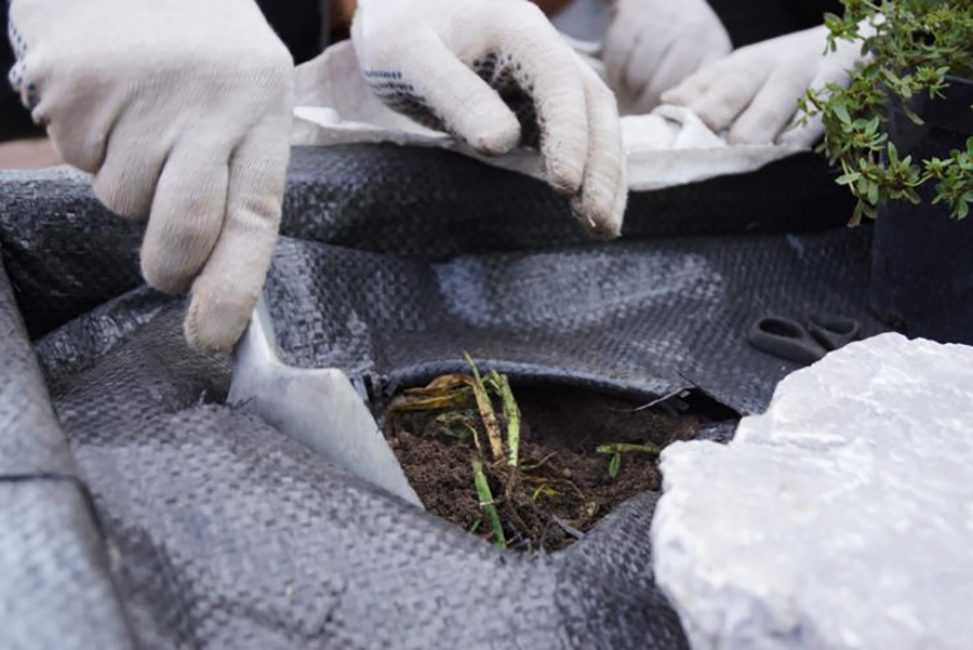 Продумывают размещение растений, учитывая их дальнейший рост, и приступают к посадке. Геотекстиль прорезают ножницами, края подворачивают. Выкапывают лунку достаточного размера, добавляют плодородный слой — почву, торф, дренаж (колотый кирпич, керамзит, песок) и др. наполнители, требуемые каждому конкретному виду.