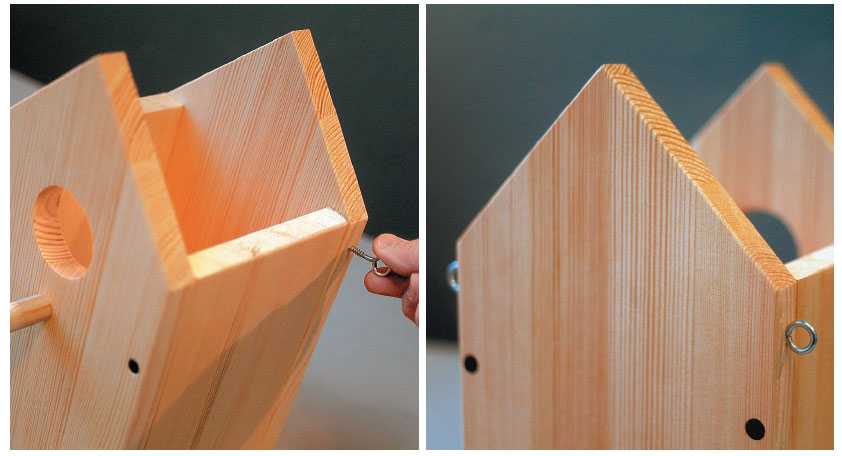В торцы задней стенки вкручиваем по две петли (если не найдется петель, замените их обычными саморезами). За эти колечки скворечник будет крепиться к стволу дерева или стене дома.