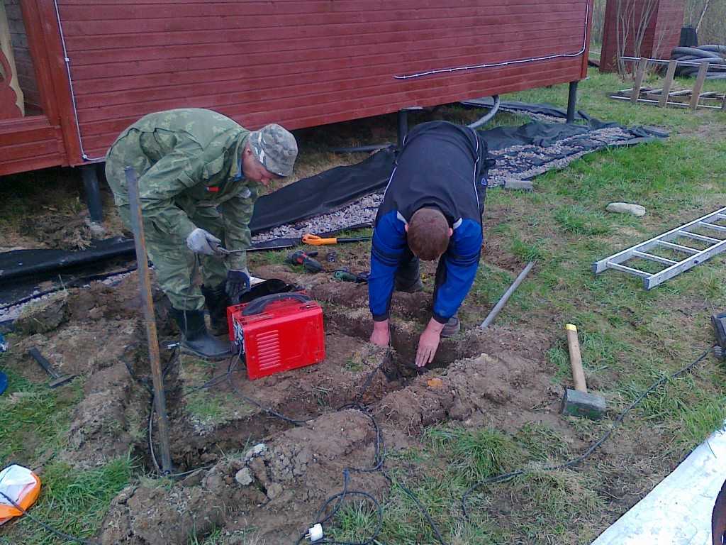 - Электроды заглубляют в грунт при помощи кувалды так, чтобы они возвышались над дном котлована или траншеи на 20 см.