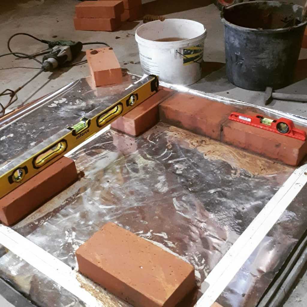 - После застывания бетона опалубка демонтируется, а сверху выкладывается площадка из огнеупорного кирпича в 2 ряда. Высота готовой площадки должна быть выше уровня пола на 20 см.