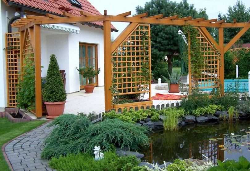 Отдельные элементы декора сада могут повторяться, как бы образуя стилистический лейтмотив. Это могут быть садовые дорожки из дикаря, распила бревен, перголы с вьющимися растениями.