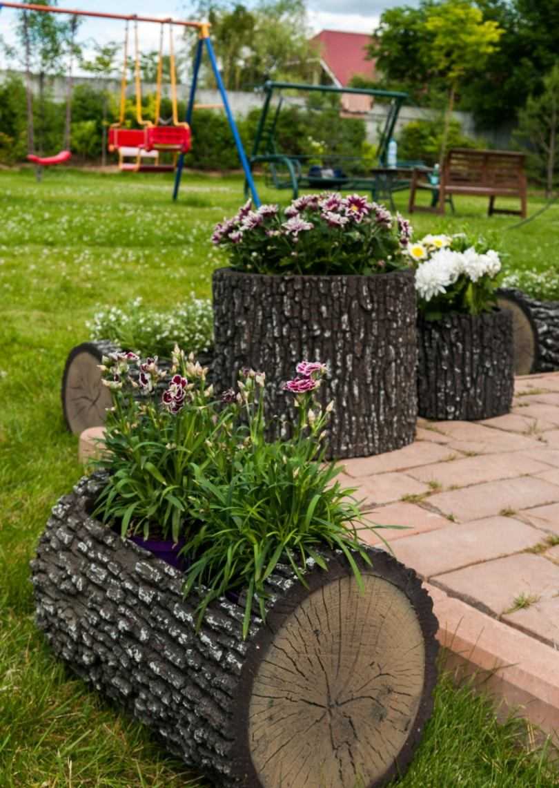 - Если у вас на участке уже нет места для клумб или просто не хочется портить газон, найдите несколько срубленных стволов дерева различного диаметра, с их помощью и вашей фантазией можно легко сделать паровоз. Сверху необходимо сделать отверстия стамеской и молотком и высадить полюбившиеся вам цветы, своевременный полив даст возможность любоваться их красотой все лето.