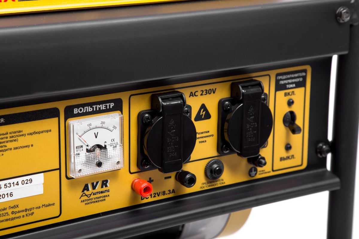 Общая мощность приборов, которые можно запитать от этого генератора, составляет 3 кВт. Прибор оборудован тремя выходами на 380, 220 и 12 В. Для своевременной дозаправки есть функция индикации масла и топлива. В случае короткого замыкания подача тока отключается автоматически.