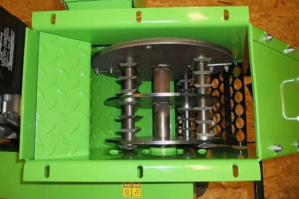 В агрегате установлен электрический или бензиновый мотор. Он приводит в действие несколько металлических ножей, которые перемалывают все, что попадает в воронку чиппера.