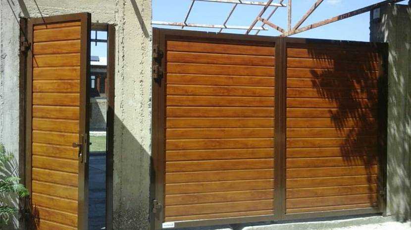 Материал определяет и внешний вид, и конструкцию, и размеры. Самыми распространёнными можно назвать металл и дерево. Это наиболее доступные варианты дверей в заборе.