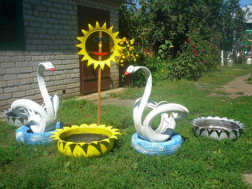 Подбор инструментария. И усердствовать особо не надо. Помните, что клумбы из шин с фото – это воплощенные бюджетные идеи, когда владелец дачного участка пытался проявить себя, показать свое мастерство, создавая из бывшего в употреблении материала новый шедевр. То есть не тратьте много денег на реализацию мечты по созданию клумбы из шин в форме лебедя. Ищите все подходящее в чуланах на чердаках вашего загородного дома или где-то среди хлама гаража.