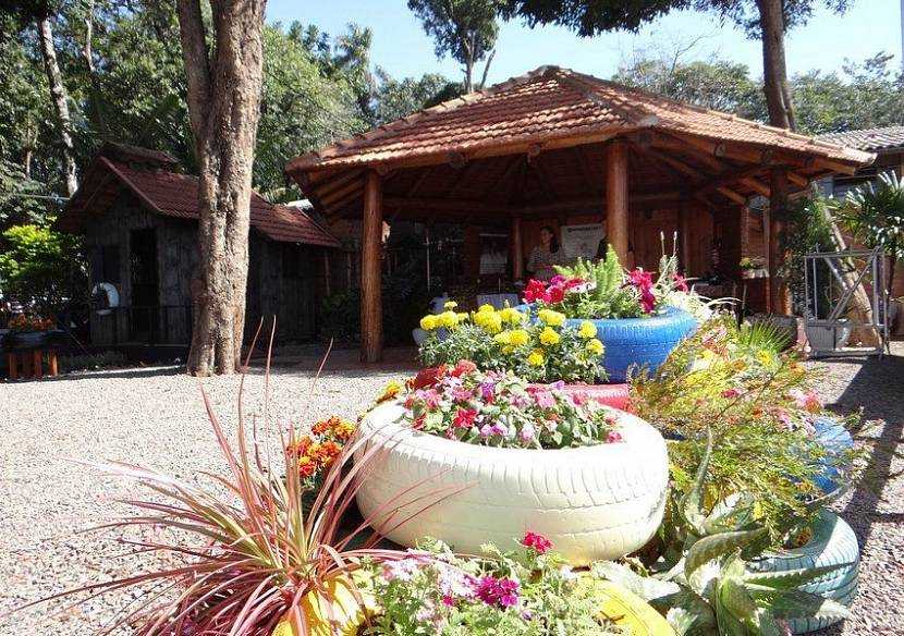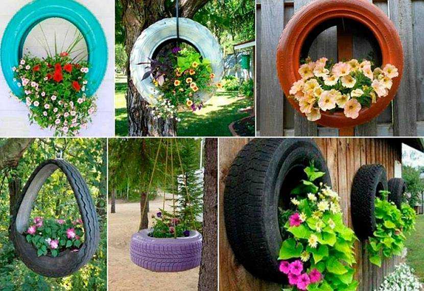 Если на участке мало свободного места, то применяют подвесные цветники. Автомобильные покрышки фиксируют на цепях, на специальных опорах в виде кашпо. В вертикальные клумбы из шин высаживают компактные растения: