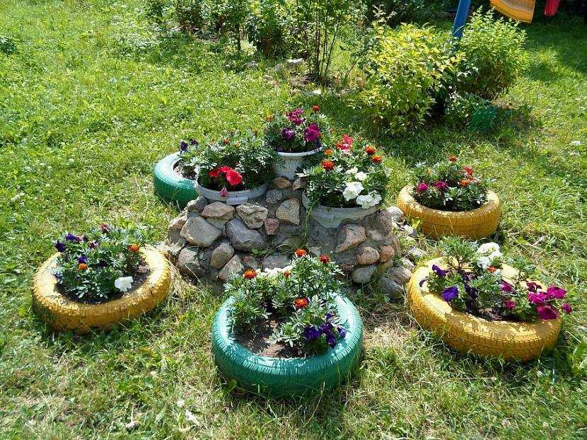 Яркие клумбы разной высоты, выполненные из автомобильных шин