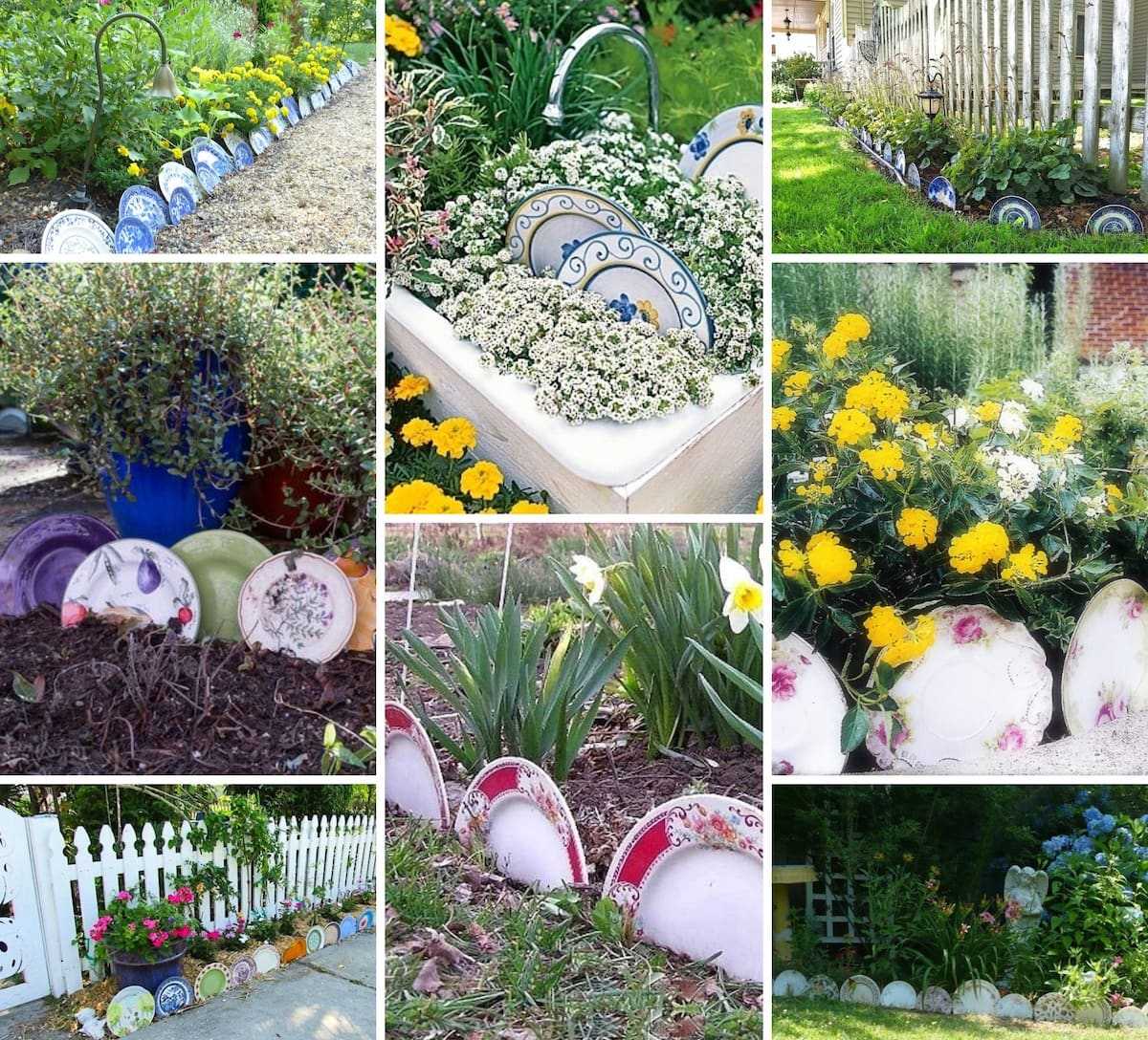 Из тарелок. Отличный декор вокруг цветников создают установленные вертикально тарелки. Целесообразно использовать не хрупкую и достаточно дорогую фаянсовую посуду, а одноразовые предметы с яркой росписью.